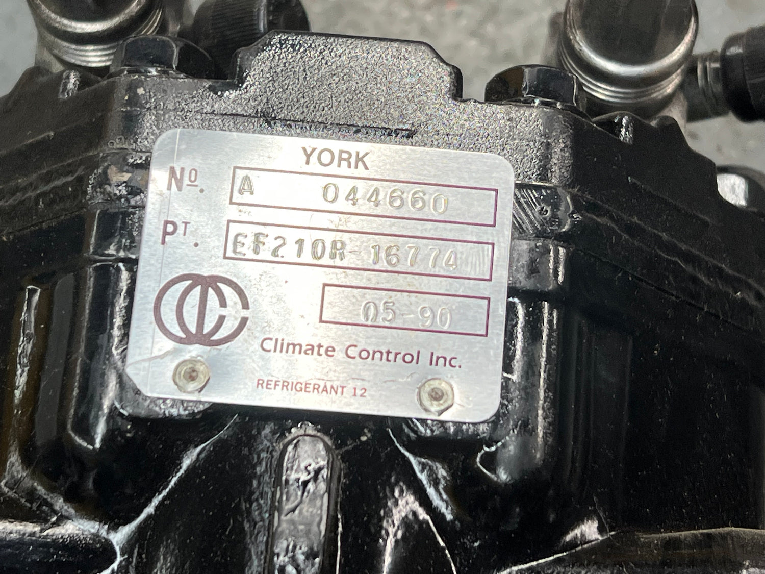 (NEW / OPENED BOX) CCI York A/C Compressor EF210R-16774 For Sale, Part # EF210R16774, EF210R 16774, 012-05526, 12-5516, G-33, Serial # A-044660, Date: 05-90, Stock # 9983