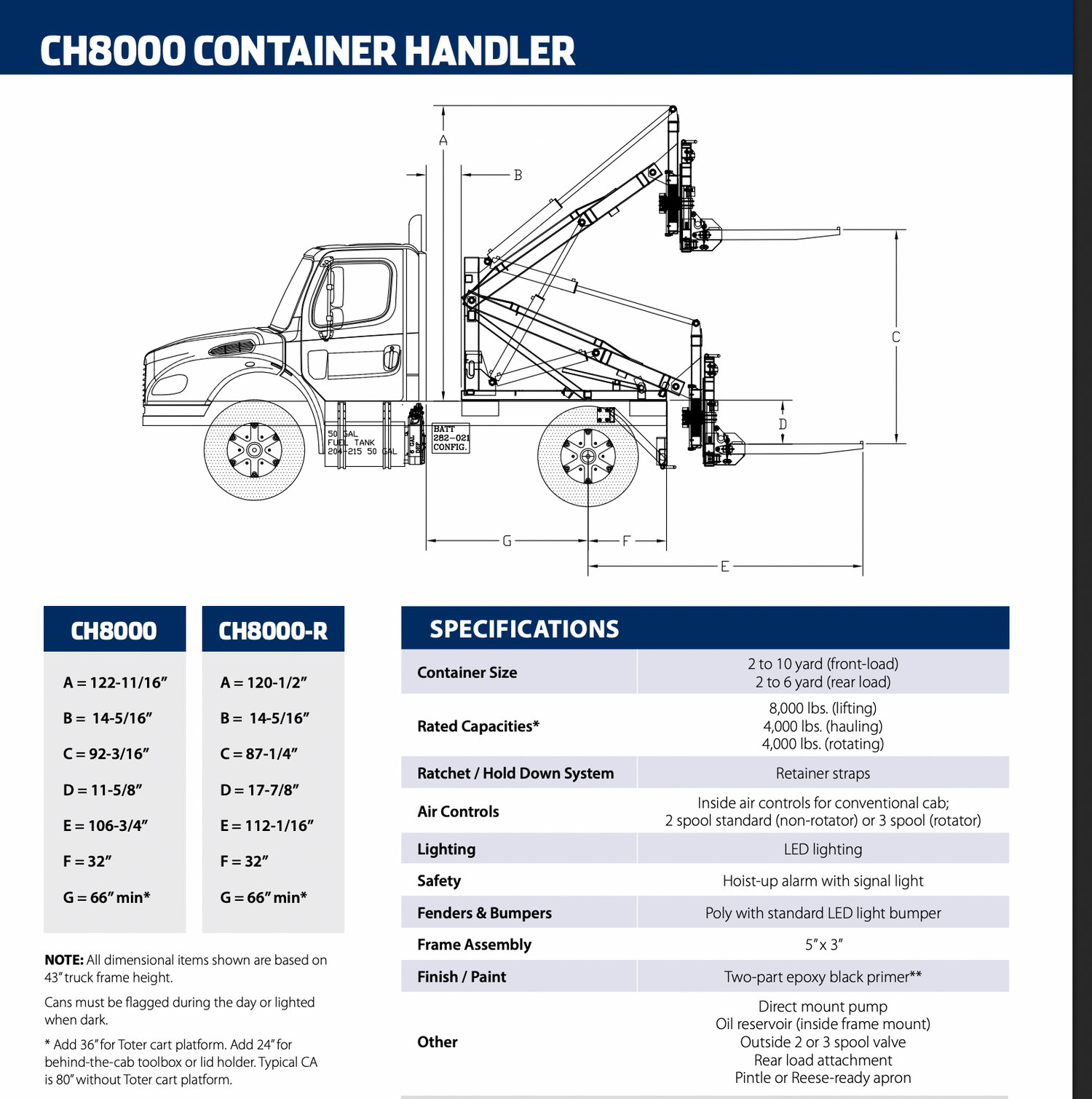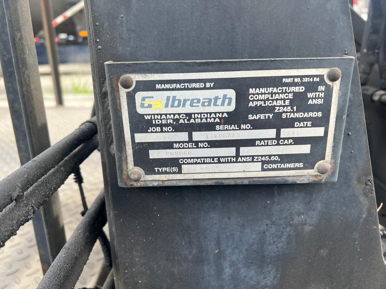 (GOOD USED) Galbreath CH8000 Container Handler w/o Rotator For Sale, Model: CH8000, Part # 3314R4, Handles REL and FEL containers w/ capacity rating up to 8K lbs., Handles FEL containers from 2 to 10 yards and REL containers from 2 to 6 yards, PULLED OFF 2005 FREIGHTLINER M2 106, Serial # 13WCH443, Stock # 9811-1, ***ONLY CONTAINER HANDLER*** REFER TO PHOTOS!