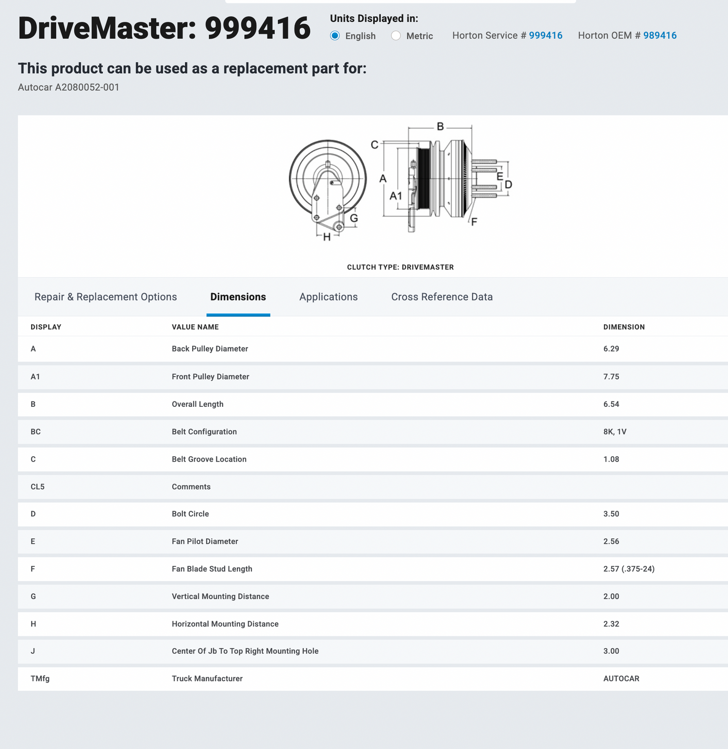 999416 Cummins ISL Horton DriveMaster Fan Clutch Part # 999416 is backordered and will ship as soon as it is back in stock.