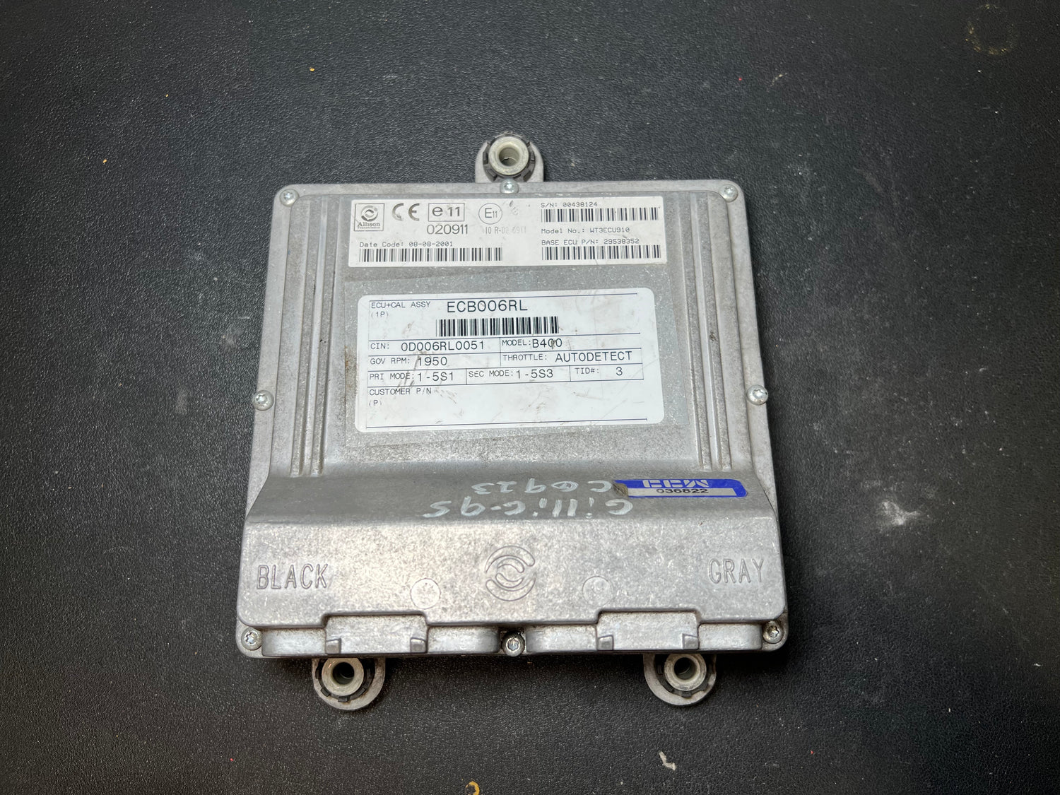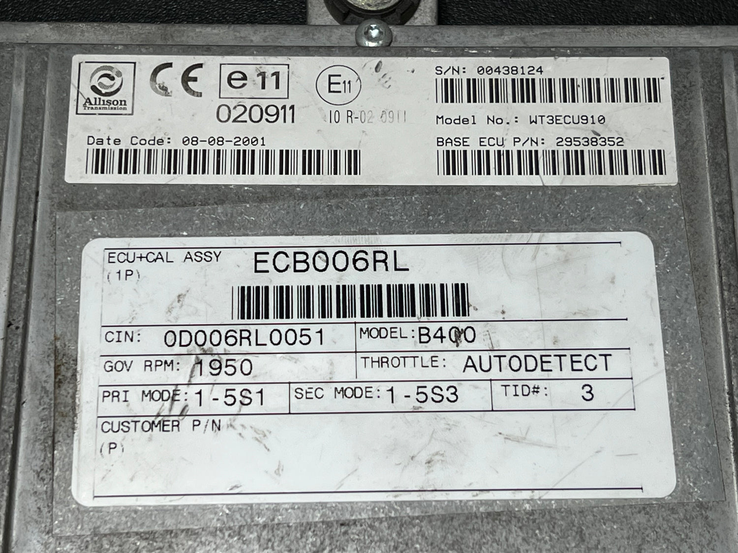(GOOD USED & INSPECTED) 2001 Allison B400 Transmission Control Module (TCM) Part # 29538352 For Sale, e11, 020911, 10R-020911, Part # 29538352 Model No. WT3ECU910, ECU+CAL ASSY ECB006RL, CIN: 0D006RL0051, Model: B400, GOV RPM: 1950, THROTTLE: AUTODETECT, PRI MODE: 1-5S1, SEC MODE: 1-5S3, TID#: 3, Serial # 00438124, Stock # 9154 | Tested & Inspected!