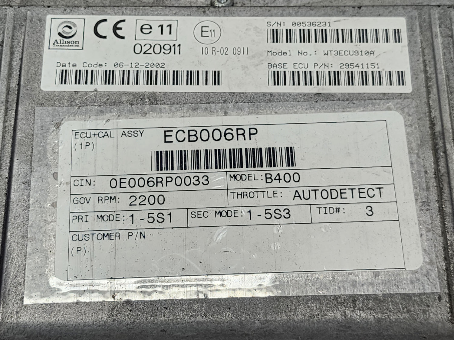 (GOOD USED) 2002 Allison B400 TCM Part # 29541151, Model No WT3ECU910A, e11, 020911, ECU +CAL ASSY ECB006RP, CIN 0E006RP0033, Gov RPM 2200, PR Mode 1-5S1, Serial # 00536231, Stock # 4259