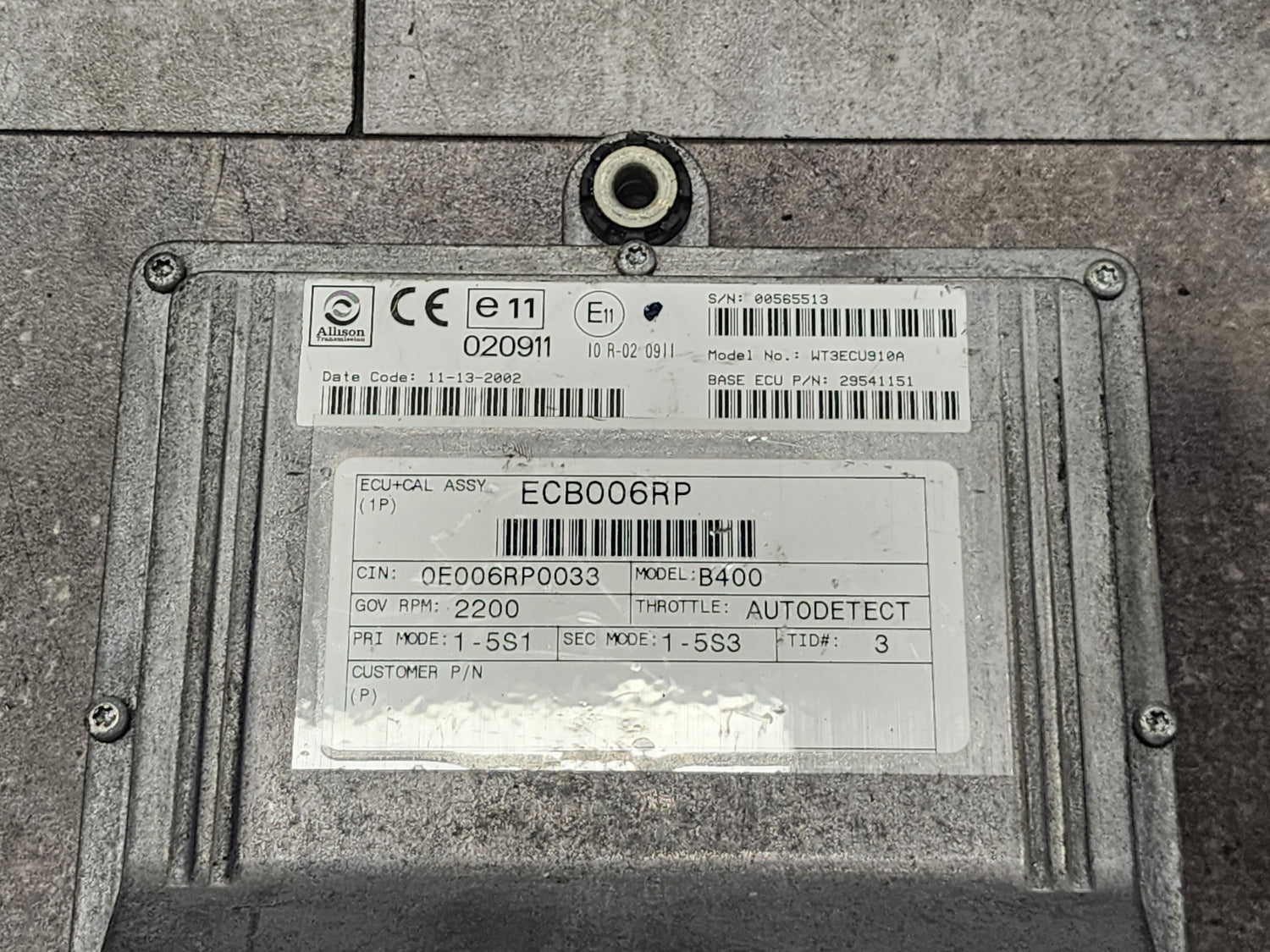(GOOD USED) 2002 Allison B400, Model No.: WT3ECU910A, Base ECU P/N 29541151, E11, 020911, 10R-020911, ECU+CAL ASSY # ECB006RP, CIN # 0E006RP0033, PR Mode 1-5S1, Serial # 00565513 Stock # 4164