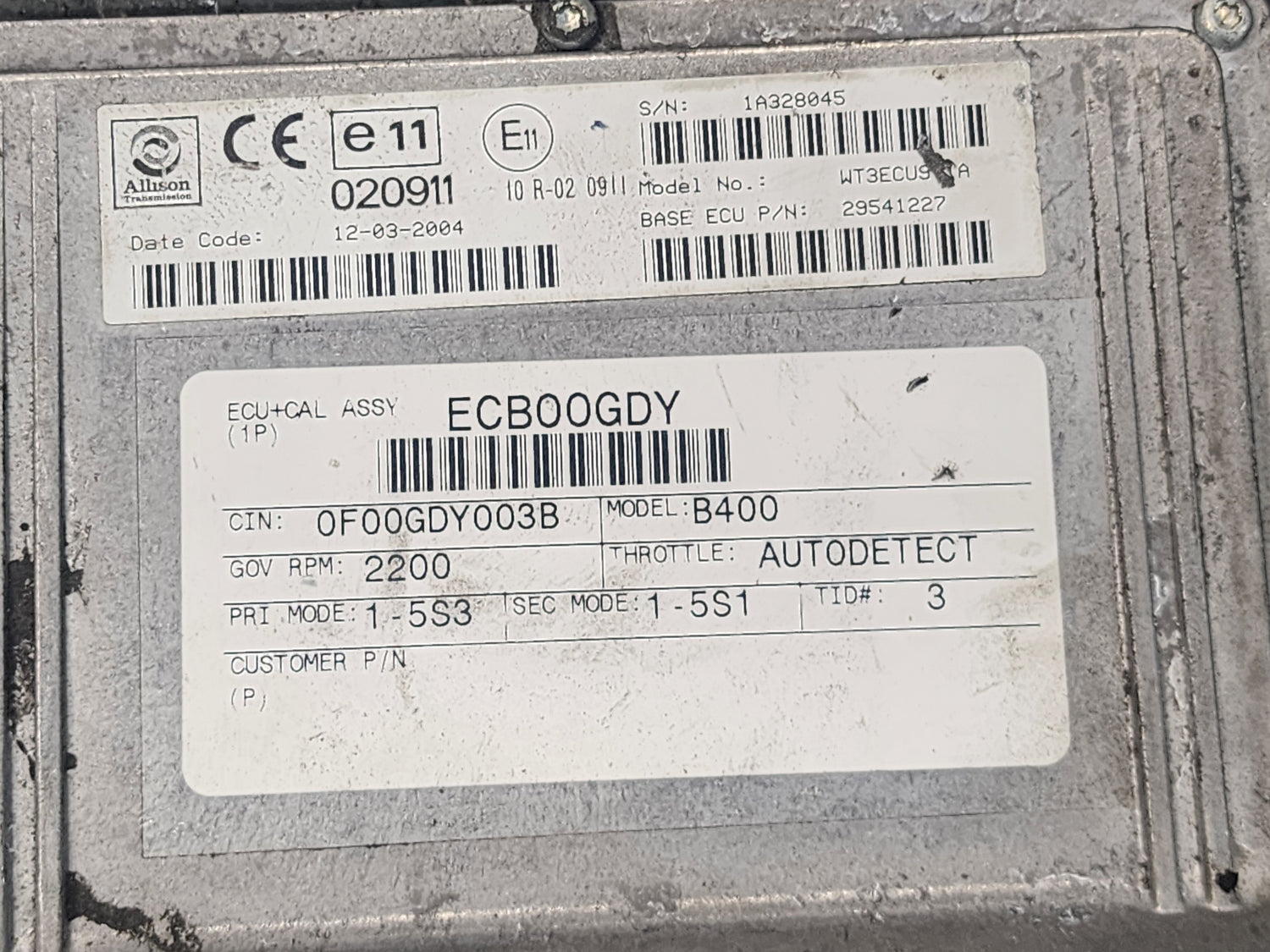 (GOOD USED & TESTED w/ WARRANTY) 2003 Allison MD3060 TCM Part # 29541227 For Sale, e11, 020911, 10R-020911, Model No. WT3ECU911A, ECU+CAL ASSY: ECB00GDY, CIN # OF00GDY003B, GOV. RPM: 2200, PRI Mode: 1-5S3, SEC Mode: 1-5S1, TID# 3, Serial # 1A008945, Stock # 8560 | Tested & Inspected!