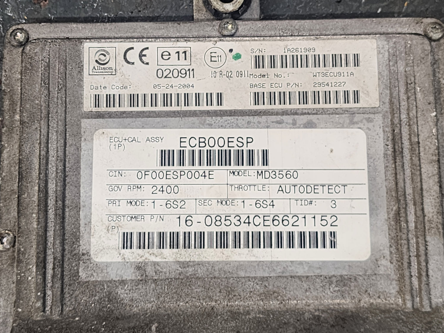 (GOOD USED & TESTED) 2003 Allison MD3060 TCM Part # 29541227 For Sale, e11, 020911, 10R-020911, Model No. WT3ECU911A, ECU+CAL ASSY: ECB00ESP, CIN # OF00ESP004E, GOV. RPM: 2400, PRI Mode: 1-6S2, SEC Mode: 1-6S4, TID# 3, Customer P/N 16-08534CE6621152, Serial # 1A261909, Stock # 8561 | Tested & Inspected!