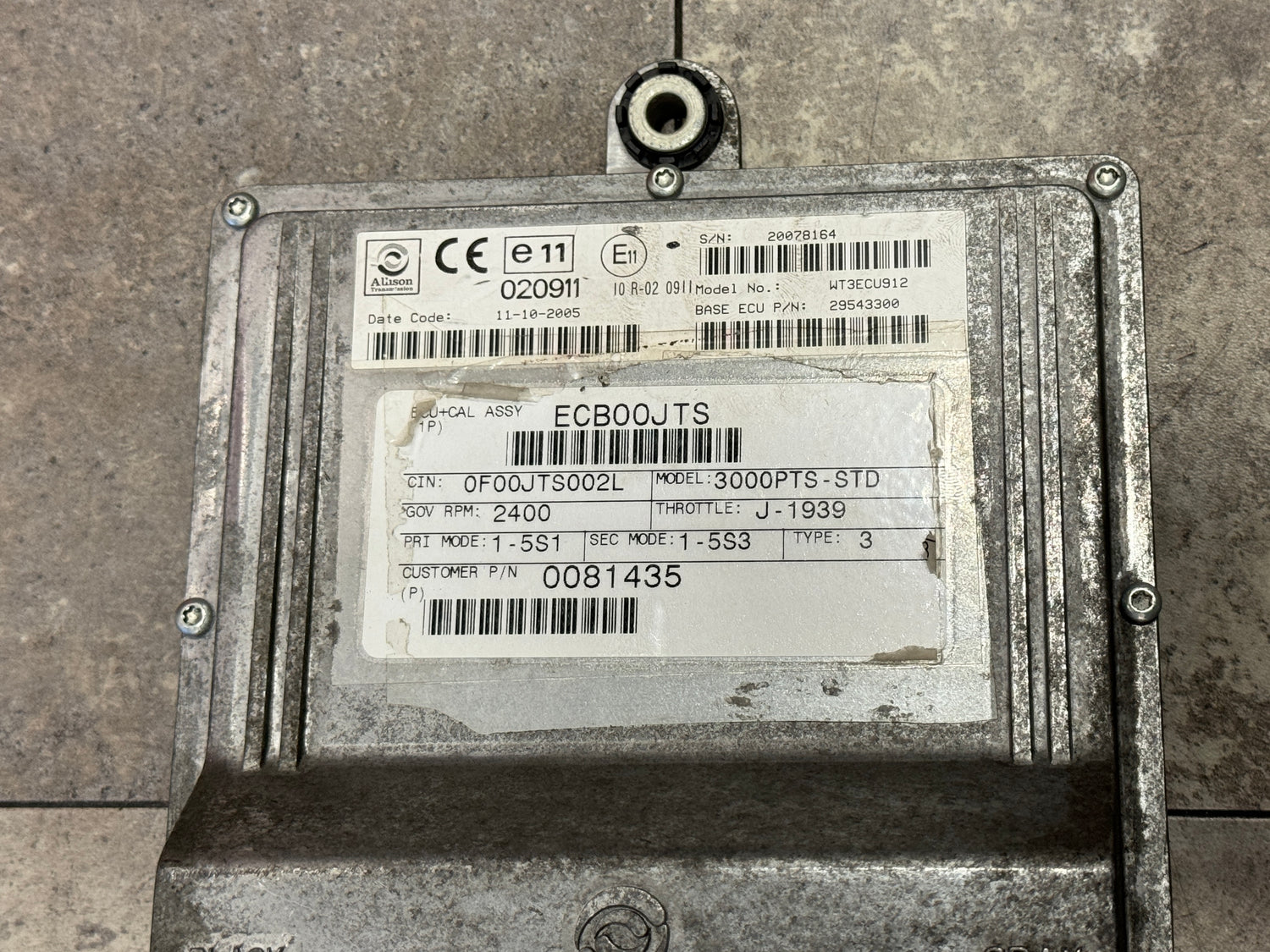 (GOOD USED & INSPECTED) 2005 Allison 3000PTS TCM Part # 29543300 For Sale, e11, 020911, 10R-020911, Model No. WT3ECU912, 3000PTS-STD, ECU+CAL ASSY: ECB00JTS, Model: 3000RDS, CIN: 0F00JTS002L, GOV RPM: 2400, Throttle: J-1939, PRI Mode: 1-5S1, SEC Mode: 1-5S3, Customer P/N 0081435, Serial # 20078164, Stock # | Tested & Inspected!