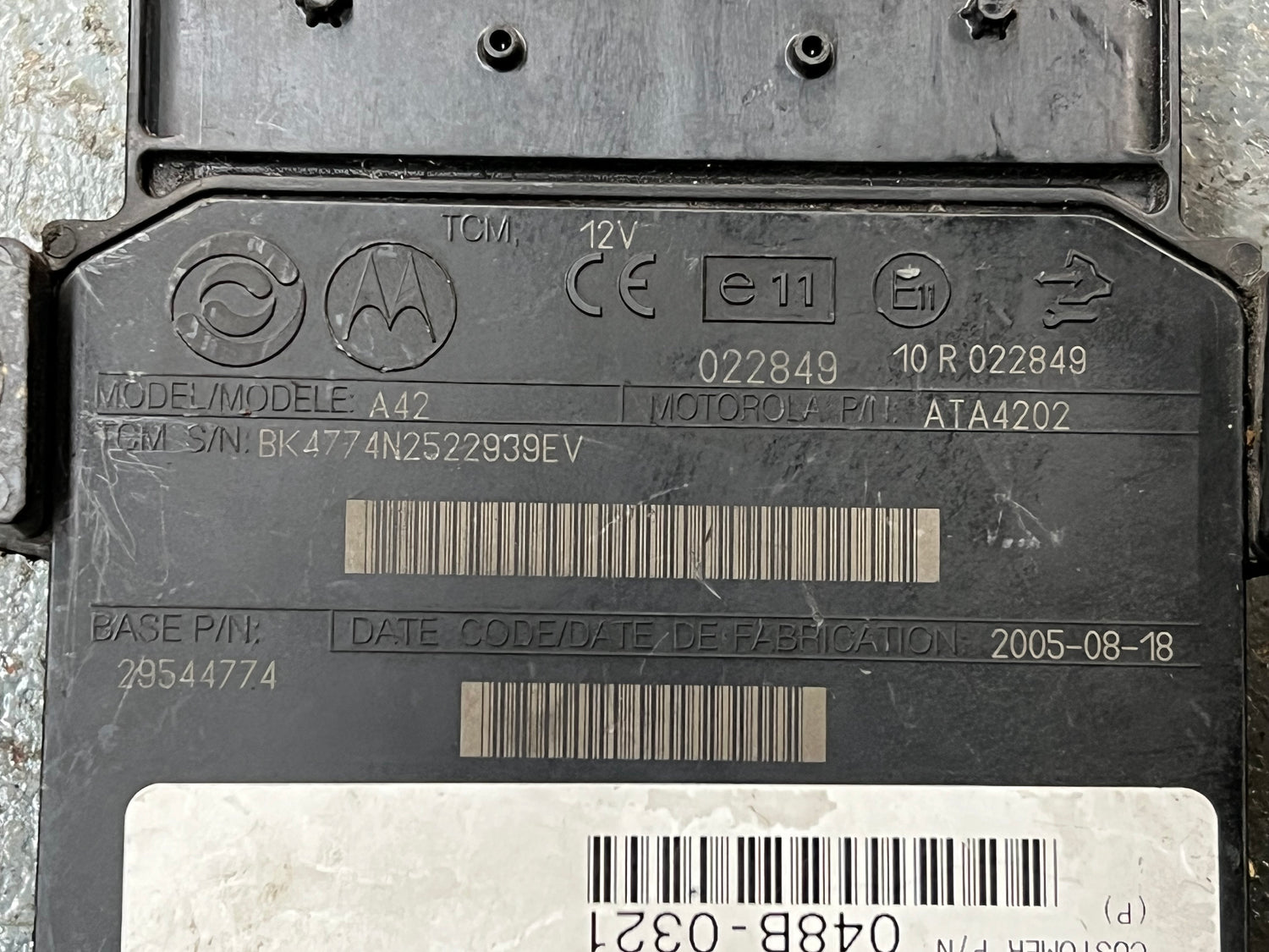 (TESTED w/ WARRANTY) 2005 Allison 4000RDS Transmission Control Module (TCM) Part # 29544774 For Sale, 12V, Model No. A42, e11, 10R022849, 022849, Part # 29544774, Supplier Part # ATA4202, TCM+CAL ASSY: A42001EA, CIN: 43001EA0042, Model: 4000RDS, GOV RPM: 2100, Throttle: AUTODETE, PRI Mode: 115-S1, SEC Mode: 112-S1, Customer P/N 048B-0321, Serial # BK4774N2522939EV, Stock # 9193 | Tested & Inspected!