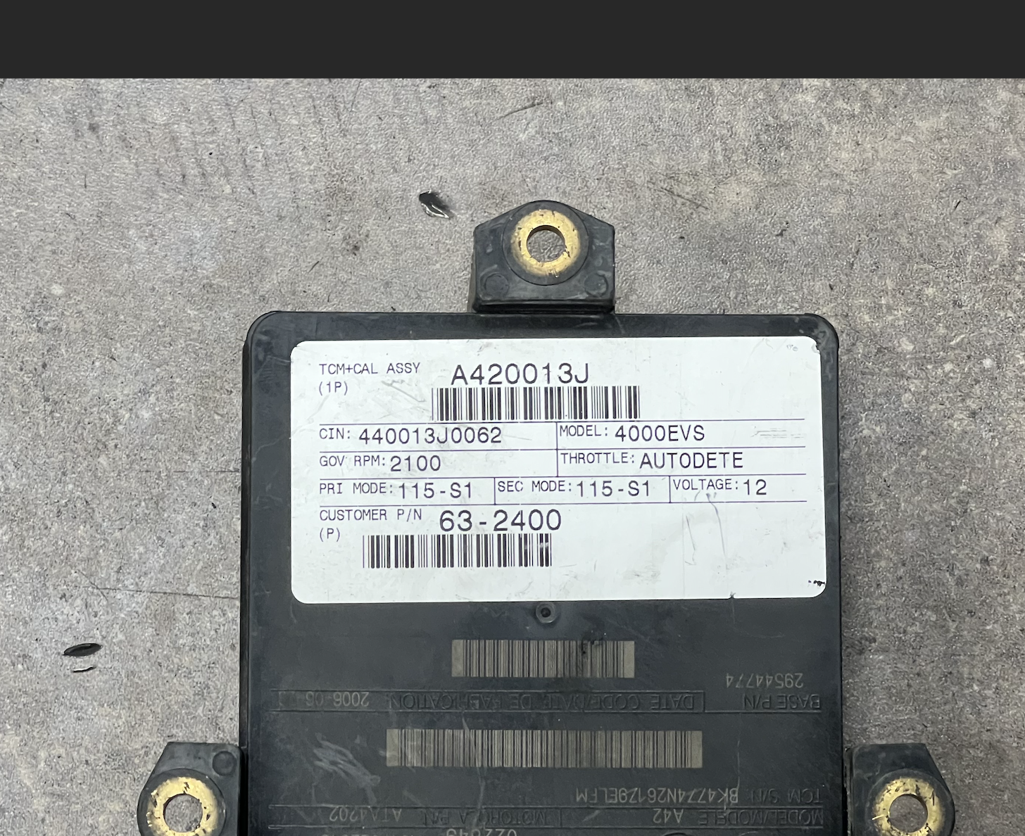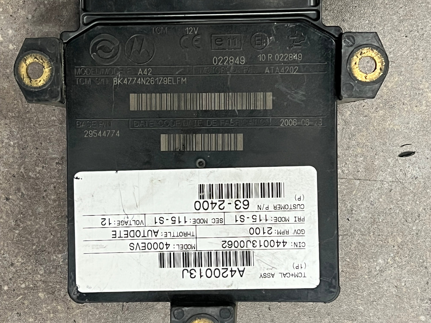 (GOOD USED) 2006 Allison 4000EVS Transmission Control Module (TCM) Part # 29544774 For Sale, 12V, Model No. A42, e11, 10R022849, 022849, Part # 29544774, Supplier Part # ATA4202, TCM+CAL ASSY: A420013J, CIN: 440013J0062, Model: 4000EVS, GOV RPM: 2100, Throttle: AUTODETE, PRI Mode: 115-S1, SEC Mode: 115-S1, Customer P/N 63-2400, Serial # BK4774N26179ELFM, Stock # 8483 | Tested & Inspected!