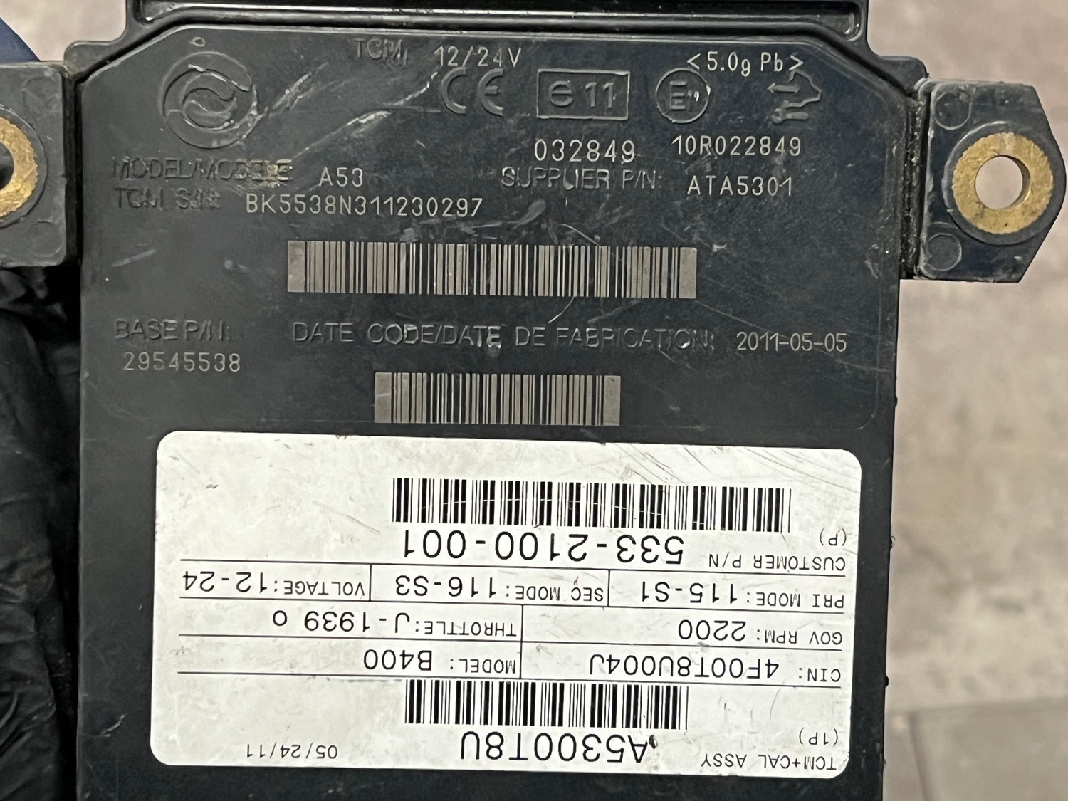 (TESTED w/ WARRANTY) 2011 Allison B400 Transmission Control Module (TCM) Part # 29545538 For Sale, 12/24V, Model No. A53, e11, 10R042849, 032849, Part # 29545538, Supplier Part # ATA5301, TCM+CAL ASSY: A5300T8U, CIN: 4FOOT8U004J, Model: B400, GOV RPM: 2200, Throttle: J-1939 o, PRI Mode: 115-S1, SEC Mode: 116-S3, Customer P/N 533-2100-001, Serial # BK5538N311230297, Stock # 8480 | Tested & Inspected!