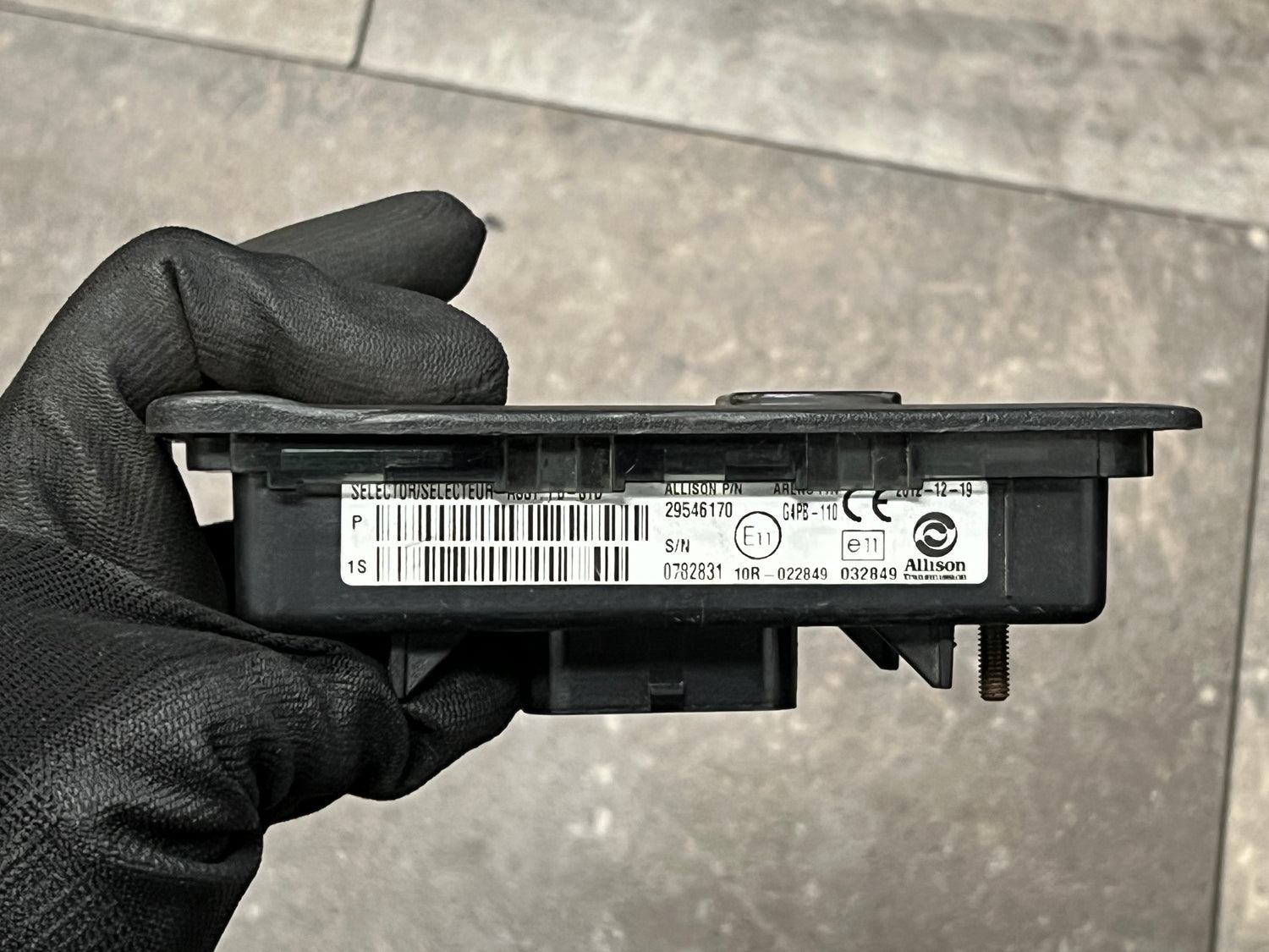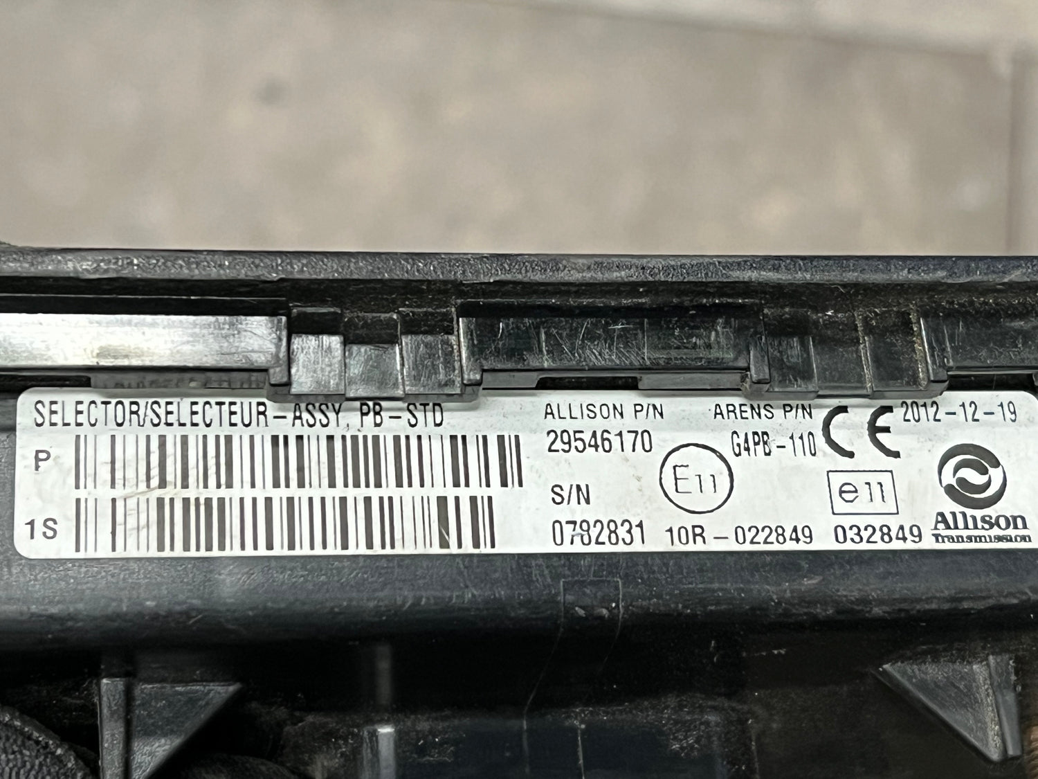 (TESTED w/WARRANTY) 2011 Allison Transmission Electronic Shifter Selector Part# 29546170 For Sale, 10R-022849, e11, Allison part # 29546170, Arens Part # G4PB-110, Selector-ASSY, PB-STD, Serial # 0782831, Stock # 8659