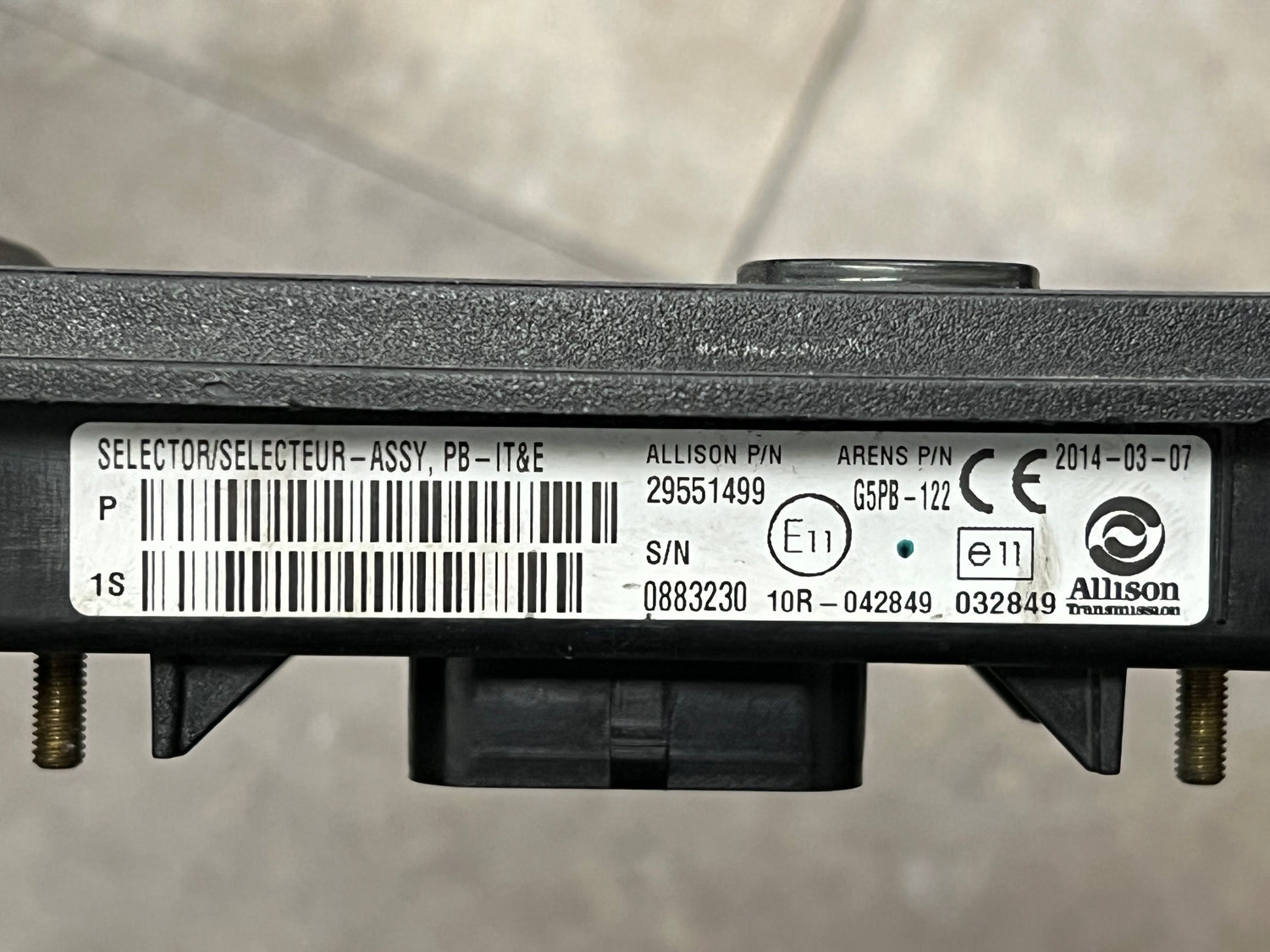 (TESTED w/WARRANTY) 2014 Allison 29551499 Transmission Push Button Electric Shift Pad For Sale, 10R-042849, 032849, E11, SELECTOR/SELECTEUR-ASSY, PB-IT&E, Part # 29551499, Arens Part # G5PB-122, G5PB 122, G5PB122, Serial # 0883230, Stock # 8675 | Tested & Inspected!