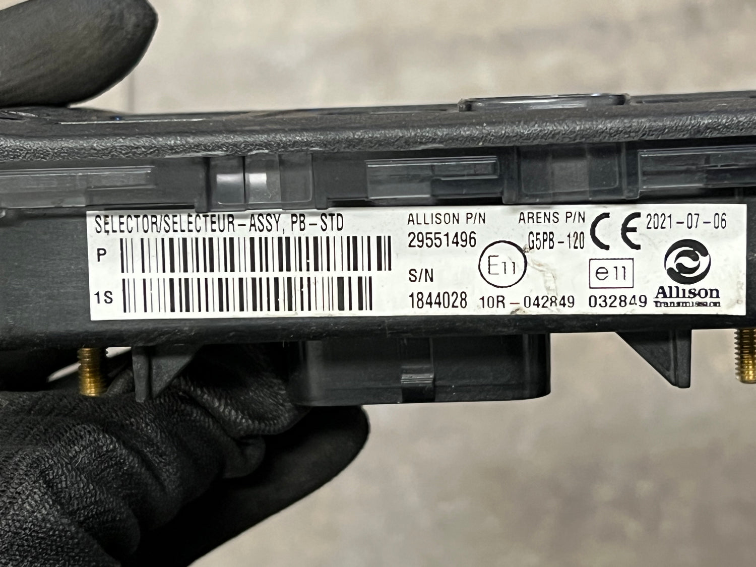 (TESTED w/ WARRANTY) 2021 Allison Transmission Push Button Electric Selector Pad 29551496 For Sale, E11, 10R-042849, 032849, PB-STD, ARENS Part # G5PB-120, G5PB 120, G5PB120, Allison Part # 29551496, Serial # 1844028, Stock # 8663 | Tested & Inspected!