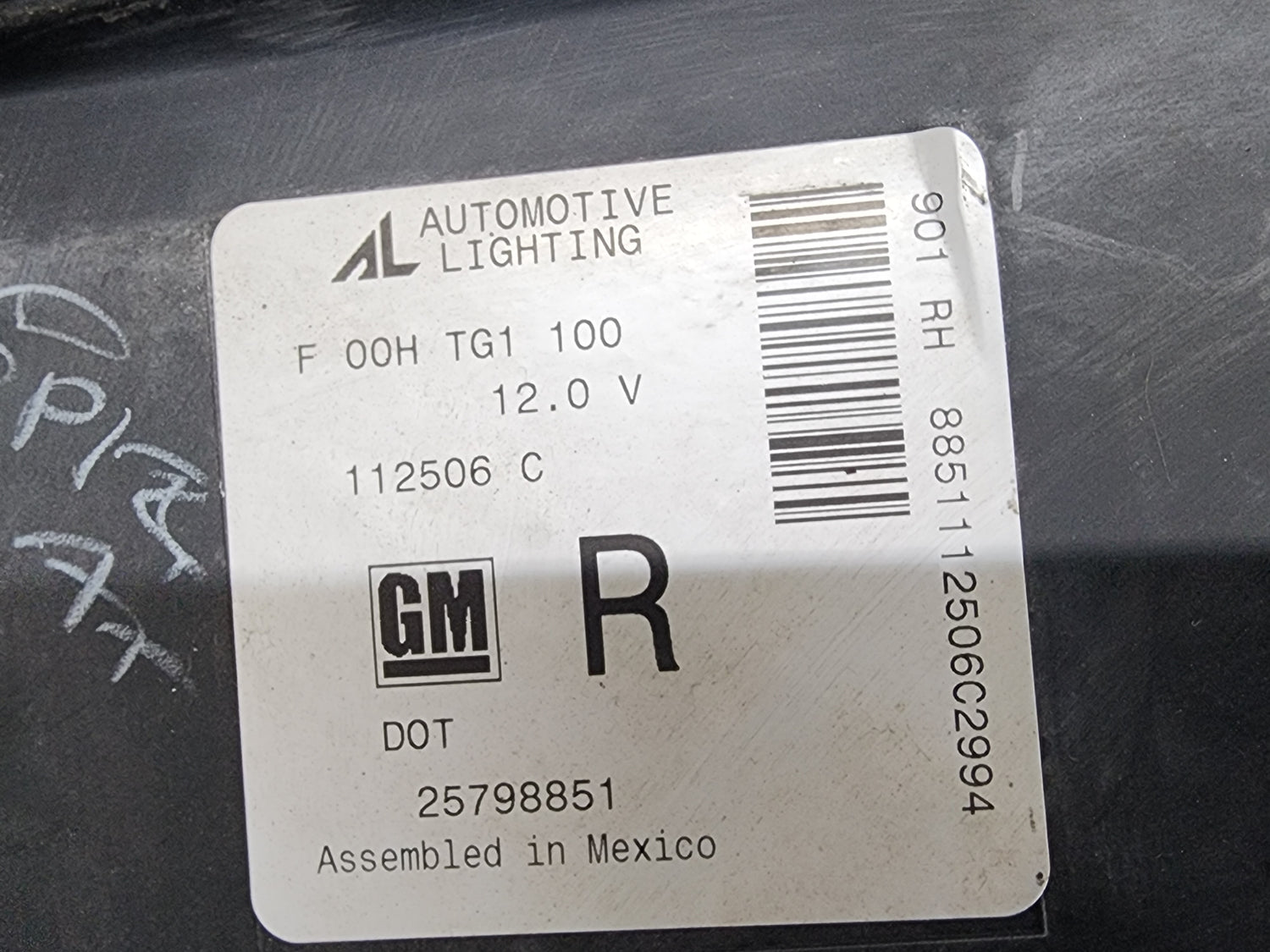 (GOOD USED) Automotive Lighting 2007-2013 GM OEM Passenger (RIGHT) Side Front Headlight 25798851 For Sale, OEM Part # 25798851, 901 RH 8851112506C2994, F 00H TG1 100, 12.0V, 112506C, Housing Part # PP-T40, 6002ta0078, Tool #1, 3157A, 905, Stock # 7657