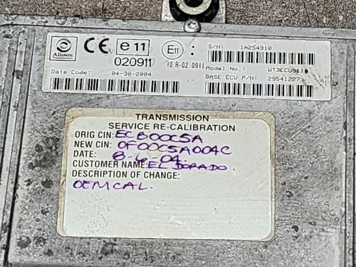 (GOOD USED) 2004 Allison TCM Part # 29541227 For Sale, e11, 020911, 10R-020911, Model No. WT3ECU911, CIN # 0F00C5A004C, Serial # 1A254910, Stock # 5699 | Tested & Inspected!