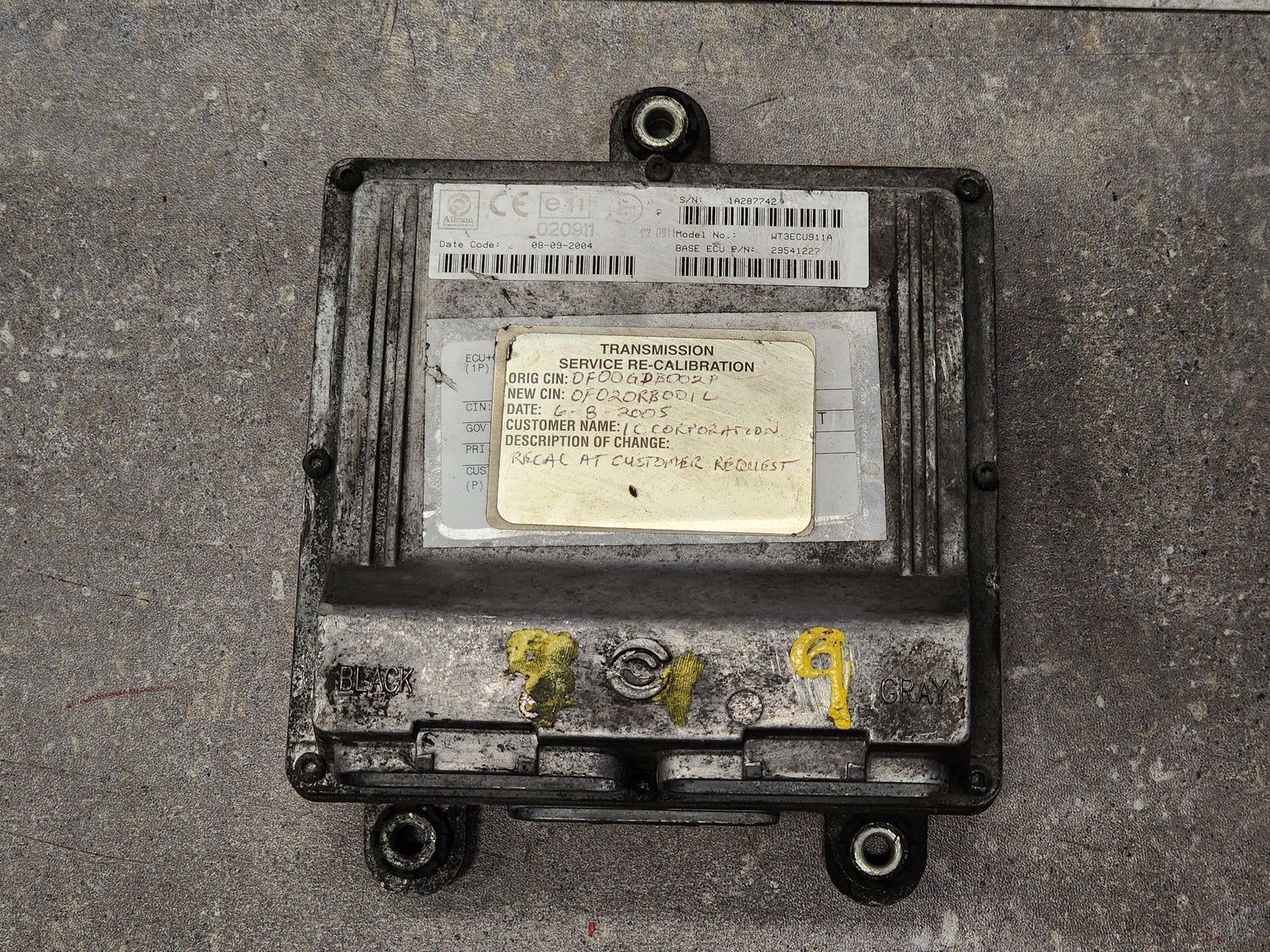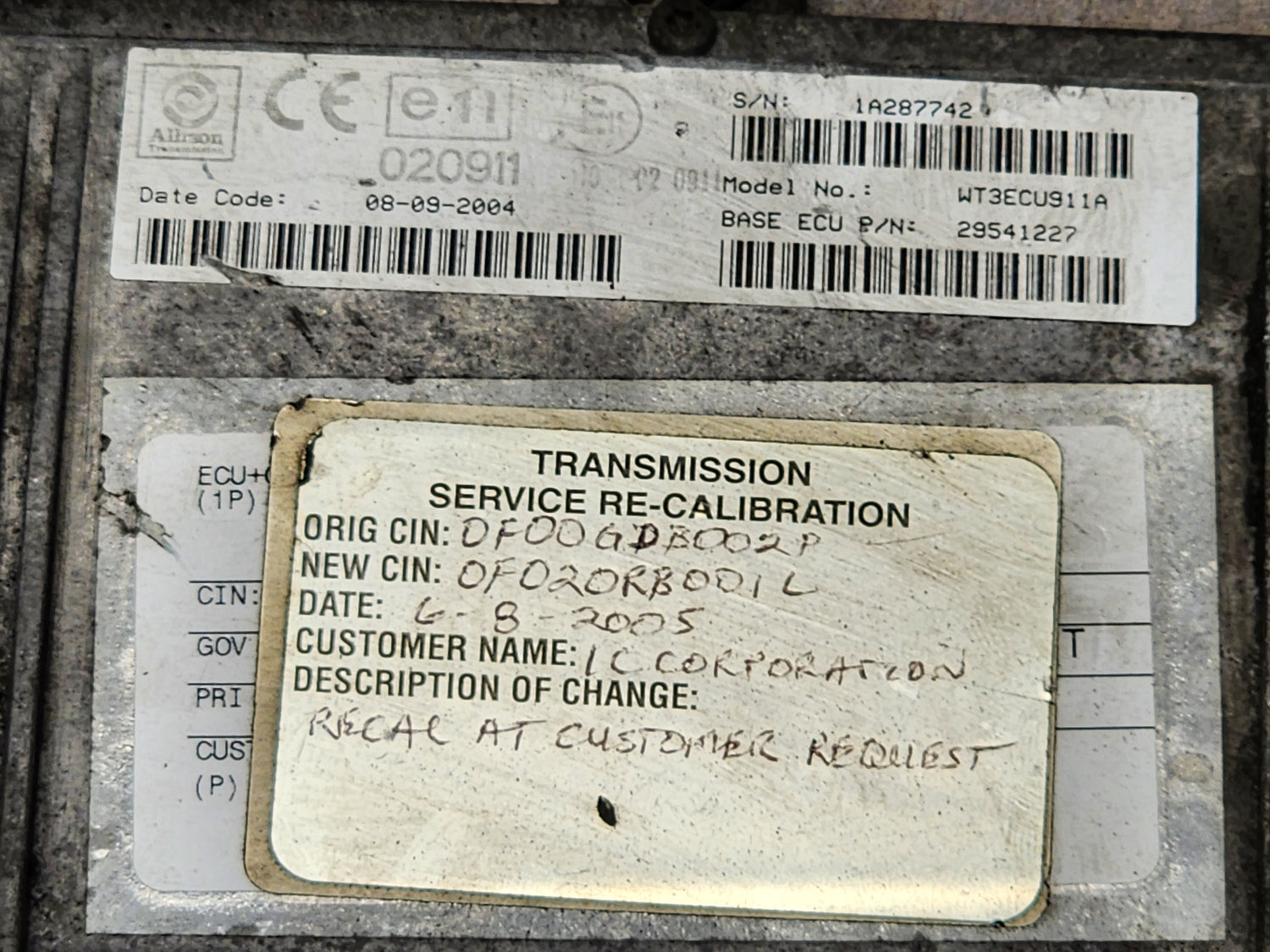 (GOOD USED) 2004 Allison TCM Part # 29541227 For Sale, e11, 020911, 10R-020911, Model No. WT3ECU911A, CIN # 0F020RB001L, Serial # 1A287742, Stock # 5715 | Tested & Inspected!