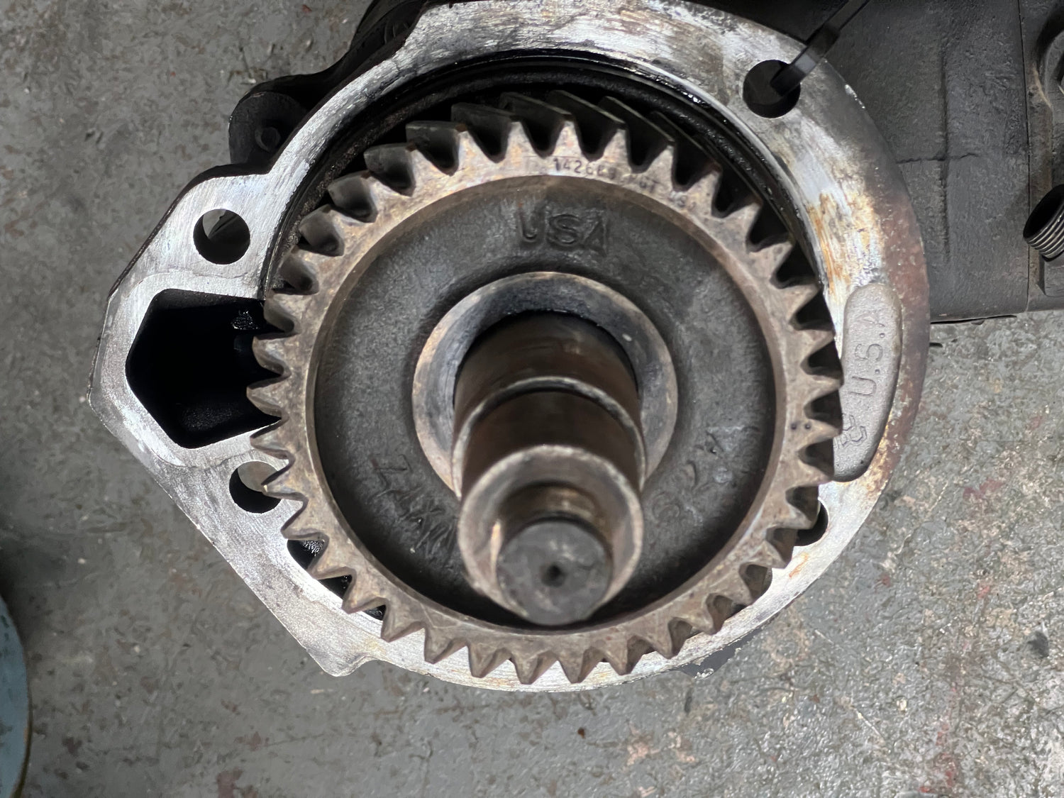 (GOOD USED) Cummins N14 SS296E Air Brake Compressor 3558602 For Sale, OEM Part # 3558602, Model: SS296E, Serial # 1K1193M, Cover Part # 153964 7 Air Supply, Gear Part # 142689, Governor Part # KN18530, Stock # 6482