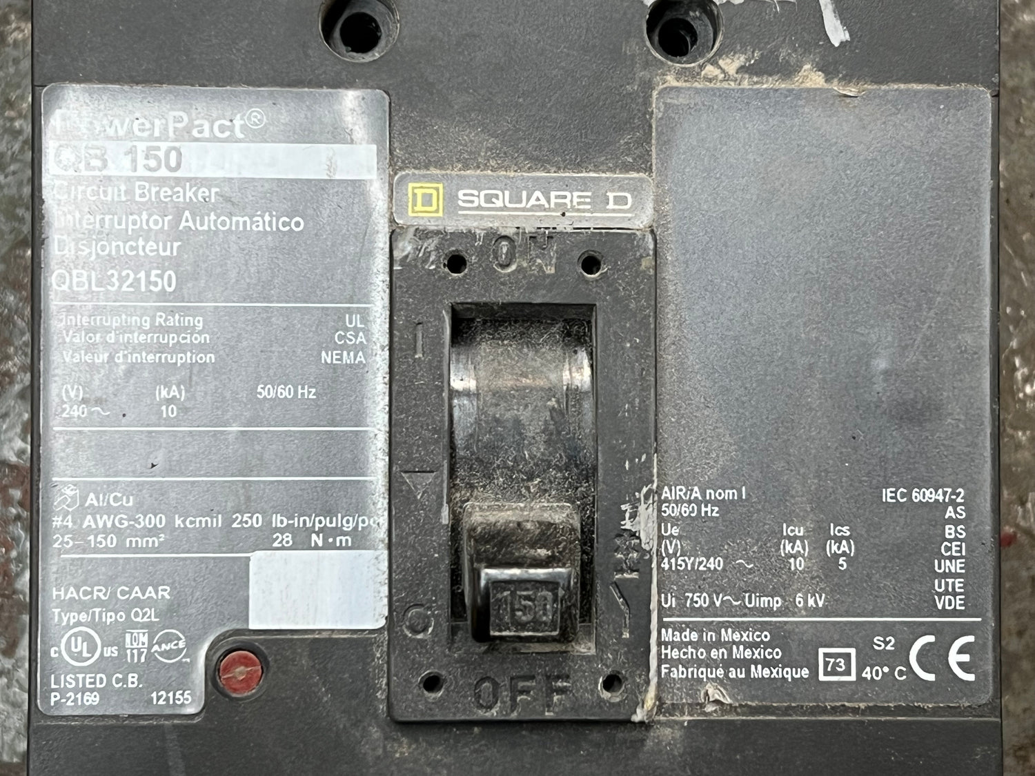 (GOOD USED) Square D Q2L MOLDED CASE CIRCUIT BREAKER QBL32150 FOR SALE, Model: QBL32150, 240V 150A,150 A,240 V AC, Circuit Breaker, Metering breakers, Q-Frame, Thermal Magnetic, UL Listed, 50/60 Hz, Circuit breaker, PowerPacT Q, 150A, 3 pole, 240VAC, 10kA, lugs, thermal magnetic, 80%, Stock # 9533